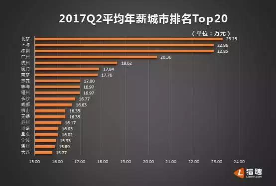 在2017年二季度平均年薪最高的20个城市中,排名前五的城市依次是北京、上海、深圳、广州和杭州,除去杭州,其他四个城市的平均年薪均在20万元以上。北京以23.25万元的平均年薪排名第一,上海的平均年薪只比深圳高出100元。这表明,一线城市的薪资差距正在缩小。