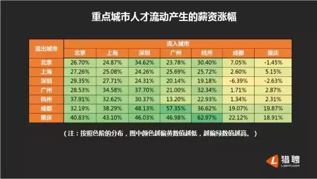 在七大城市之间的人才流动中,重庆流入杭州产生的薪资涨幅最高,为62.97%;深圳流入成都产生的薪资涨幅最低,为-6.39%。