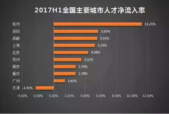 在2017年上半年全国主要城市人才净流入率排名中,杭州人才净流入率(地区人才净流入率=该地区人才净流入人数/该地区人才流动总人数×100%)最高,为11.21%,明显高出其他城市。杭州就业机会多、人才进入难度较小、薪资相对高、生活环境好,综合优势强,因而对外地人才有较大的吸引力。