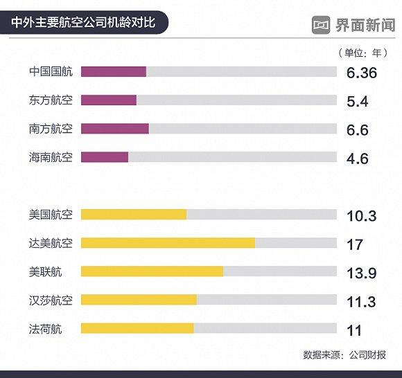 根据2016年的财报数据,美国三大航空公司-美国航空(AmericanAirlines)、达美航空(DeltaAirlines)以及美国联合航空(UniteAirlines)的平均机龄分别达到10.3年、17年以及13.9年,汉莎航空(LufthansaGroup)的平均机龄是11.3年,法荷航集团(AirFrance-KLM)的平均机龄是11年,几乎是中国三大航的两倍。