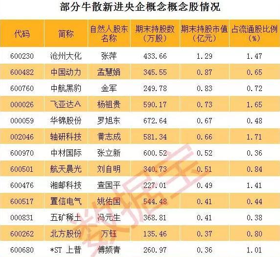 值得注意的是,在期末持股市值超过3千万的牛散新进央企改革概念股中,轴研科技、飞亚达A、沧州大化、湘邮科技、*ST上普等个股牛散持股占流通股比例超过1%。