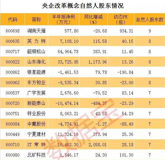 数据宝梳理央企重组概念半年报时发现,有23只股票前十大流通股东榜中出现5个以上自然人股东。其中,湖南天雁前十大流通股东榜中有9个自然人股东居首;英力特、韶钢松山、山东海化、银星能源、东方钽业等个股均有8个自然人股东。业绩估值方面看,岳阳兴长、轴研科技、中航黑豹等个股中期净利亏损,北矿科技、五矿稀土、湖南天雁、龙源技术等个股半年报净利折算的市盈率均超过百倍。