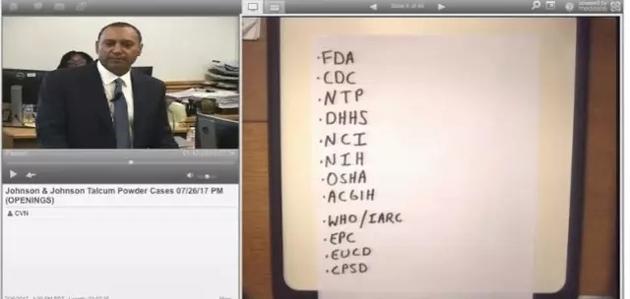 威廉姆斯在辩论致词中列举了12家包括美国食品及药品管理局(FDA)在内的权威机构,他们的研究表明滑石粉产品与致癌之间没有确切关联。