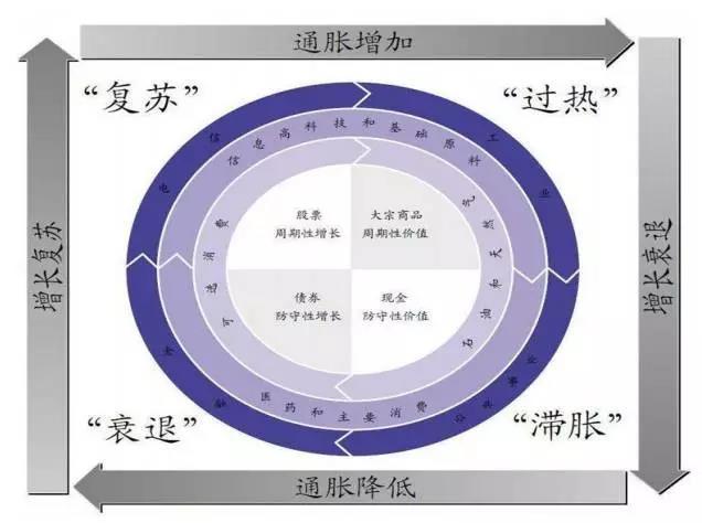 大家知道,经济是有周期波动的,在周期波动的背后,它不仅是一个技术过程,也是一个人性的轮回。经济有很多的周期,库存周期,产能周期,创新周期,房地产周期,债务周期,杠杆周期,金融周期,对我们投资影响最多的主要是库存周期和产能周期,一个是短周期,一个是中周期,一般来说,一个产能周期包含三个左右的库存周期,库存周期主要影响短期波动,产能周期主要影响中期趋势。我们做大类资产配置,按照经济周期不同阶段,不同的资产有相对收益率的表现差异,那么投资时钟背后核心是预判周期的阶段。