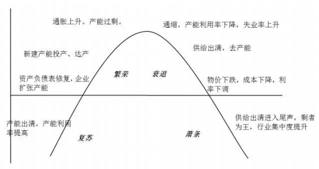 今天我们讲的周期叫产能周期,它的维度大约6—11年,一轮产能周期非常重要,一般它分四个阶段,第一阶段,在经济繁荣的时候,企业家都很乐观,认为自己做出投资决策的能力高人一筹,所以这时候你会看到产能的扩张以及随后的产能过剩。进入到第二阶段,产能过剩以后,供求格局恶化,这时候进入漫长的通缩。中小企业退出,大企业淘汰落后产能,这时候出现供给出清。进入第三阶段,可以看到行业集中度大幅度提升,剩者为王,供给需求重新平衡,修复资产负债表,为新一轮产能扩张积蓄能量。随后进入第四个阶段,企业盈利能力改善和资产负债表修复,最终会改变企业家预期,这时候会看到新一轮产能扩张,一开始带动需求,后面增加供给。
