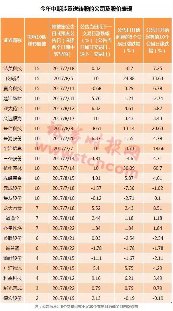 据时报君(微信ID:wwwstcncom)统计,上述推出送转方案的24家公司在公告当日或下一交易日(公告日为非交易日则选下一交易日,下同)的平均涨幅仅为3.33%,公告后5个交易日仅3只股票涨幅超过10%,公告后20个交易日仅3只股票涨幅超过20%,表现最好的杭州园林,从公告日起的最大涨幅也未超过100%,且该股为今年上市不久新股,可比性不强。
