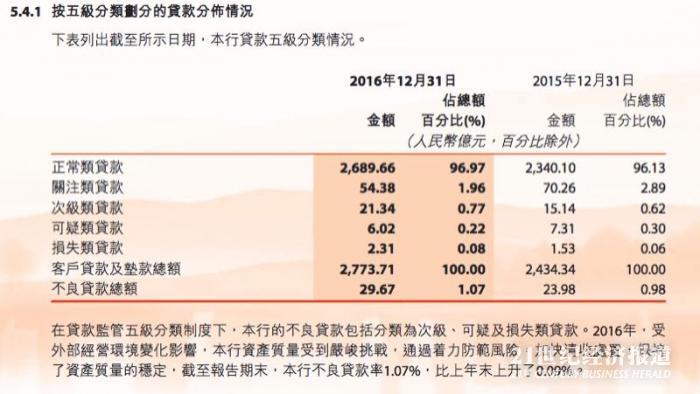 徽商银行财报称,2016年,受外部经营环境变化影响,徽商银行资产质量受到严峻挑战。截至2016年末,该行不良贷款余额29.67亿元,比上年末增加5.69亿元;不良贷款率为1.07%,比上年末提高0.09个百分点;不良贷款拨备覆盖率为270.77%,比上年末上升20.28个百分点。与不良贷款增加不同的是,关注类贷款2016年减少15.88亿元,占比从2015年末的2.89%下降至2016年末的1.96%。