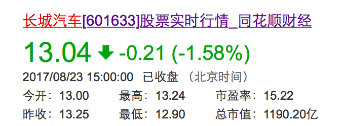 8月23日,长城汽车股份有限公司(601633)复盘,收盘价格为13.04元,较停盘前跌幅1.58%。