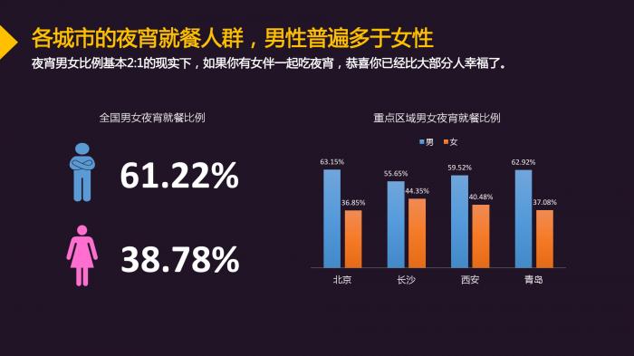 夜宵应该是夏天的保留节目了,在这份与夜宵有关的《报告》中,基于高德地图积累的海量数据,以及对全国重要城市的大数据进行计算、分析得出:我国城市夜宵消费人群中60%左右为男性,而女性占比约为38.78%,不过长沙是个例外,长沙女性夜宵比例很高,约占44.35%,高于其他城市。