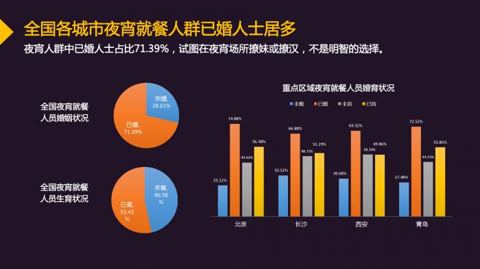 而从年龄的角度来看,年轻人是夜宵的主力军,90后与00后的总数占比达59.36%,80后占比26.14%,西安的90后最为突出,约占西安整体消费人群的54.47%。还有一个比较有趣的数据,已婚人士更喜欢吃夜宵,在北京,这个比例高达74.88%。
