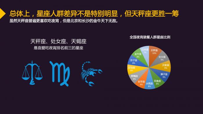 若从星座的维度来看,天秤座最好吃夜宵,占比为10.41%,处女座排名第二,天蝎座排名第三,占比分别为9.05%以及8.98%。而最不爱吃夜宵的星座则为白羊座、金牛座和双子座,你们觉得准吗?