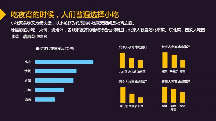 那么大家愿意为吃夜宵出行多远呢?数据显示吃货为了一顿夜宵可接受的平均距离为3764米,北京人则为4984米,小龙虾是夜宵的首选,快餐与火锅位列第二及第三。