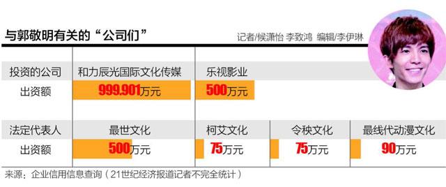 21世纪经济报道记者通过工商企业信息查询得知,郭敬明目前应该起码为5家公司法定代表人,同时还是3家公司的股东。加上版权、代言、票房收入,几年前就曝出郭敬明身家超过7亿,而他的商业版图还在扩大。从郭敬明目前公开的投融资动向看,扩张野心集中在影视文化领域。