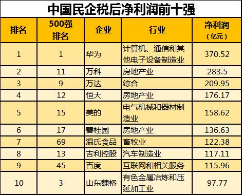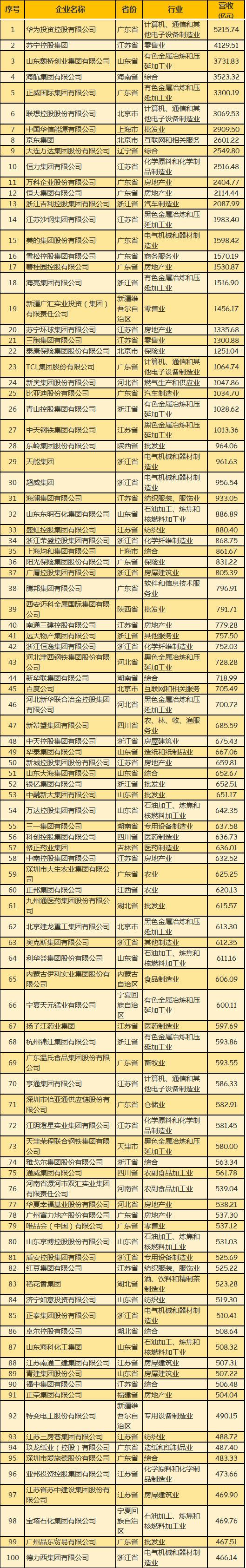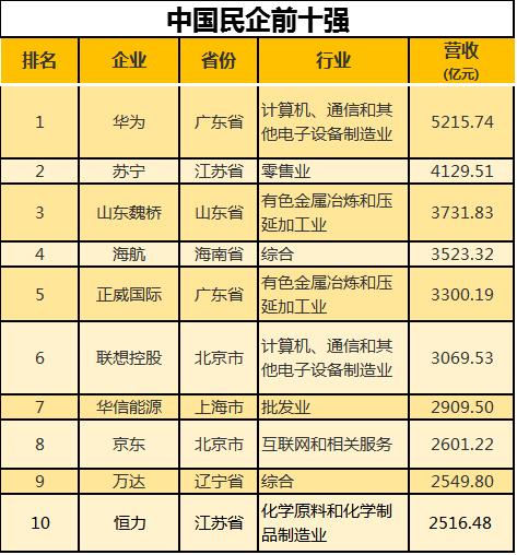 有6家企业营收突破3000亿元,分别是:华为、苏宁控股、山东魏桥、海航、正威国际、联想控股。(总榜单见文末)