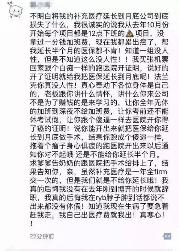 爆发点来自匿名社交应用“无秘”上的一则爆料:德勤内部一女员工加班数月,离职前查出患上甲状腺癌,随后被德勤迅速劝退,并拒绝延长医疗保险,导致员工需要自付手术费。