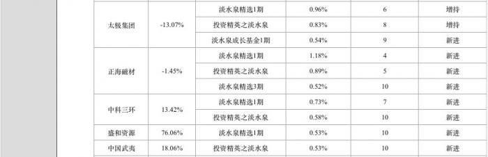具体来看,二季度,淡水泉小幅减持了持股近3年的歌尔股份,减持了万华化学和复星医药,退出了烽火通信。同时,“淡水泉精选1期”、“投资精英之淡水泉”和“淡水泉精选3期”等3只产品或单独、或“组团”新进盛和资源、正海磁材、中国武夷、中科三环4只股票。