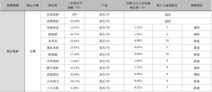 据记者统计,在大消费领域深耕多年的星石投资在二季度退出了长春高新和安妮股份,榆次同时,“星石1号”全面出动,新进了华海药业、酒鬼酒、水井坊、冀东水泥、跨境通、艾华集团、隆平高科、首旅酒店、云内动力、三七互娱。从新进个股的行业分布来看,白酒、消费类个股仍是星石的“心头爱”。