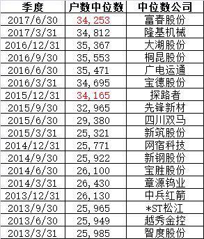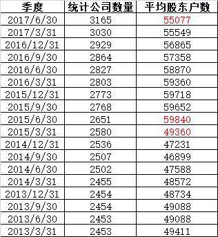 由于新股上市总是连续涨停,新股在目前市场环境中仍然具有一定溢价与炒作效应,因而统计股东户数的时候,剔除最新季度上市的股票,即统计2017年6月底上市公司股东户数,只统计到2017年3月底上市之前的公司,同理类推。
