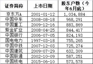 截至今年6月底,京东方A的股东户数由103.49万户,也是目前A股市场唯一一家股东过100万户的公司,中国中车以96.83万户的股东位居其后,中国重工、紫金矿业、中国银行的股东户数也都超过80万户。