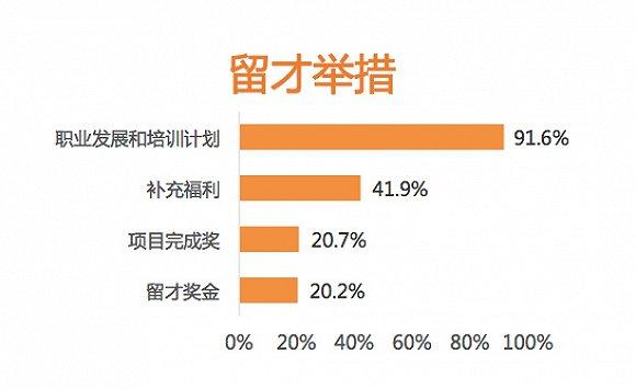 为了留住付出了培养成本的应届生,用人单位也在开创多种多样的留才计划:超过90%公司会设置职业发展和培训计划,超过20%的公司设置了补充福利、项目完成奖、留才奖金等留才项目。