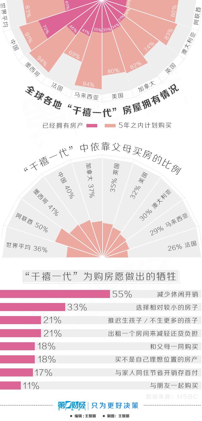 根据英国汇丰银行发布的一份针对9个国家千禧一代的调查显示,千禧一代中40%的人拥有自己的房产,83%的人在未来五年内有购房计划。中国千禧一代有房比例最高,达到了70%。其中墨西哥和马来西亚年轻人购房欲望最大,94%无房者要买房,紧接着是中国无房青年,达91%。