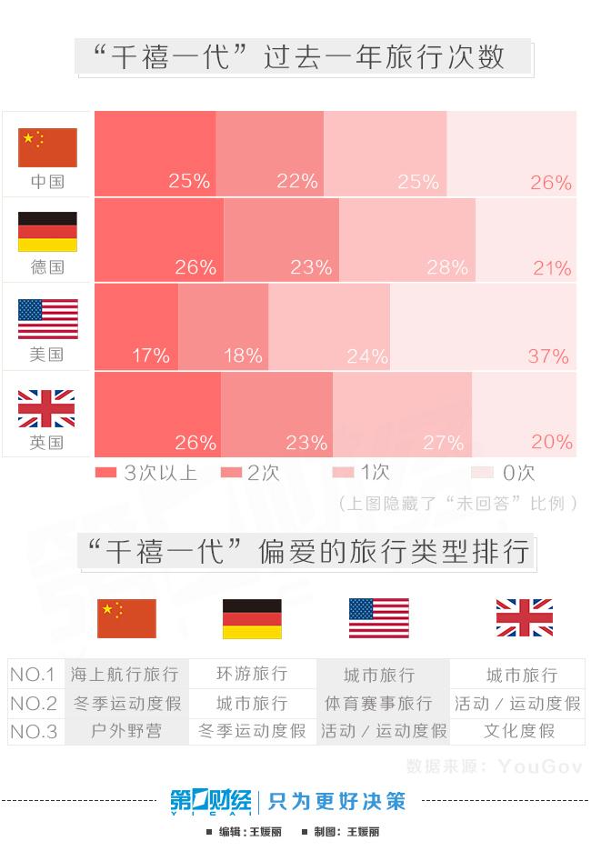 YouGov发布了最新的“千禧一代旅行者报告”,调查了占1/4人口的千禧一代的旅游订购行为。数据显示,千禧一代热衷于旅游,并且热爱冒险和文化之旅。在过去的一年中,中国73%的“千禧一代”至少旅行过1次,其中26%次数在3次以上。英国和德国“千禧一代”出游比例为77%和76%,而美国的“千禧一代”出游比例相对较低,为59%。关于旅行目的地,具有文化特色或者冒险体验的景点更受“千禧一代”的追捧。