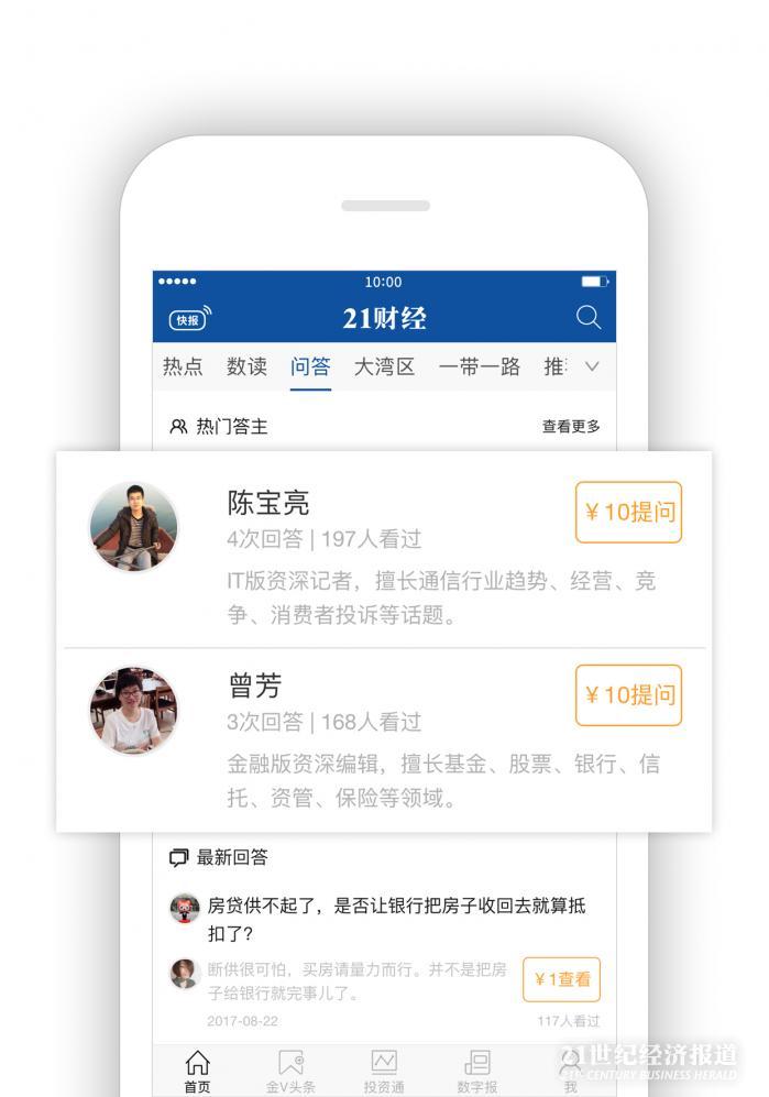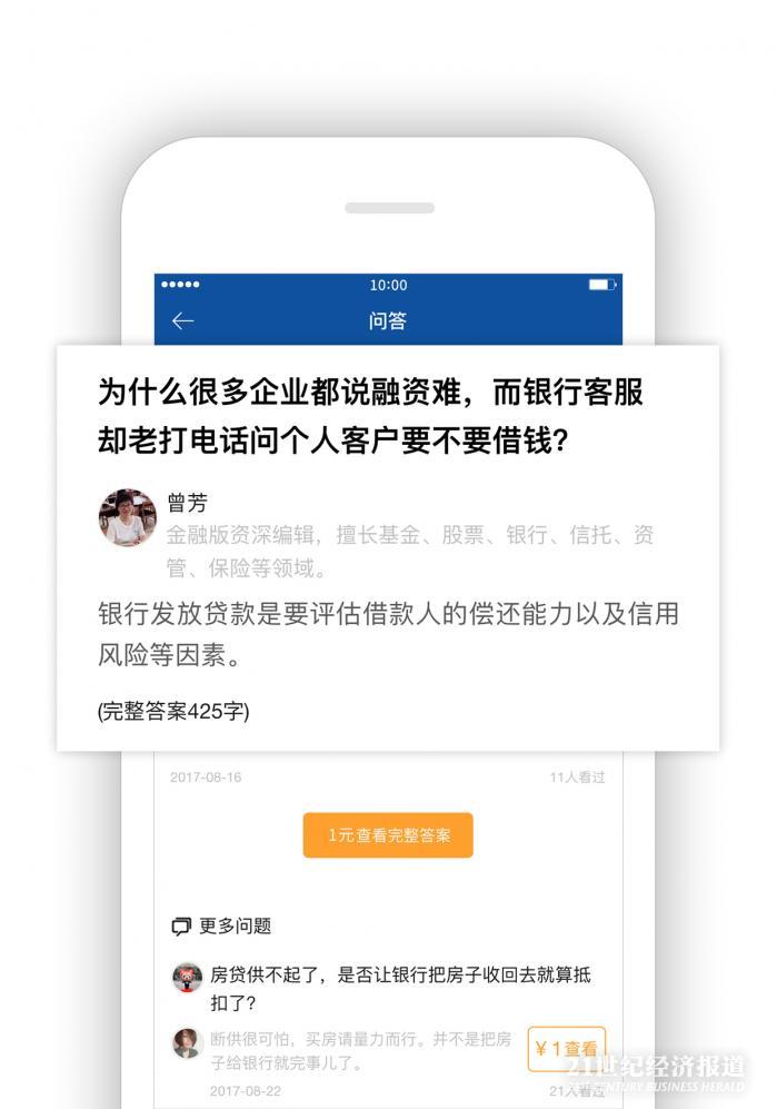 “21问答”频道,基于《21世纪经济报道》采编团队对新闻及热点的洞察优势,提供一对一专业问答服务,借助财经记者的专业知识和经验,为用户提供有价值的观点和建议,帮助用户了解财经、掌握理财技巧。系统还设有短信通知、查看过往提问、退款等功能,保障了用户体验。