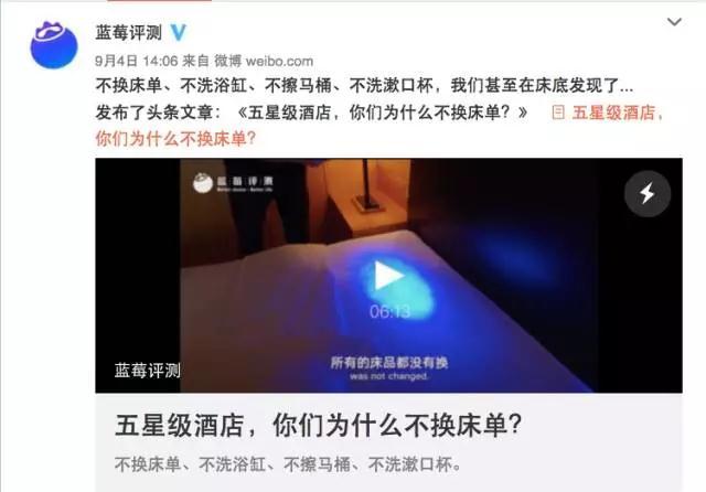 9月4日,蓝莓评测的一条题为“五星级酒店,你们为什么不换床单”的评测报告刷爆了朋友圈。文章称,该机构工作人员近日分别入住北京5家五星级酒店,发现上述酒店在住客退房后均未彻底更换床品,而马桶、浴缸、漱口杯、浴袍等物品也未做到完全清洁。