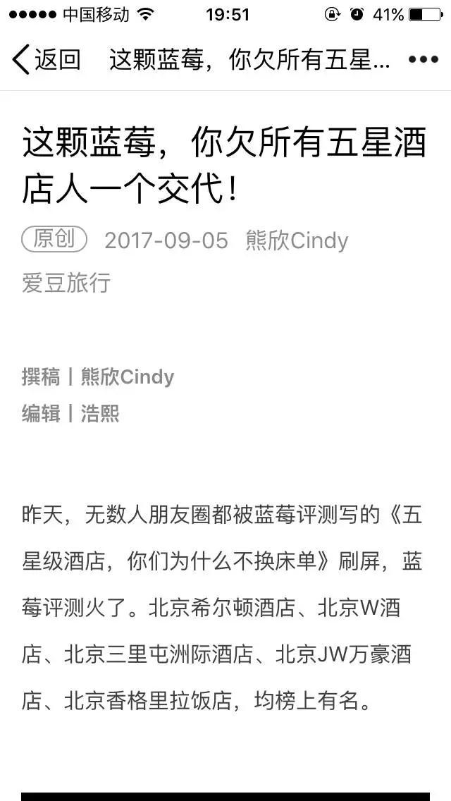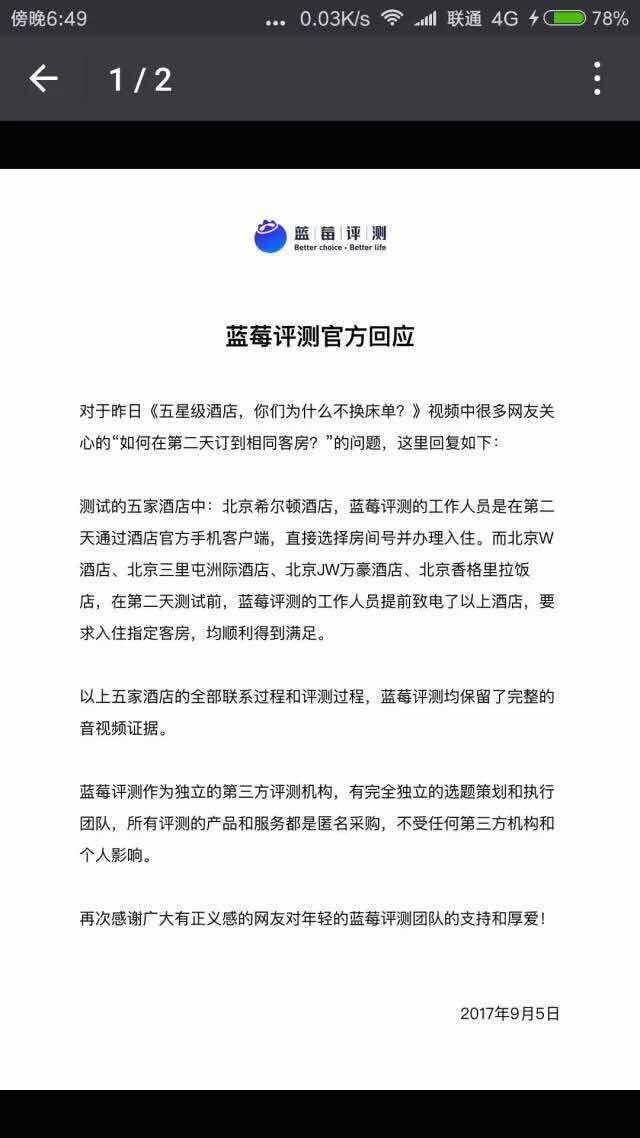 自称为独立测评机构的蓝莓评测在其微博和微信公众号发布的《五星级酒店,你们为什么不换床单?》一文称,蓝莓评测机构工作人员先后入住了北京W酒店、北京三里屯洲际酒店、北京希尔顿酒店、北京JW万豪酒店以及北京香格里拉饭店5家五星级酒店。体验后发现: