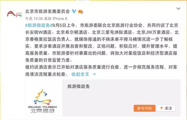 9月5日,北京市旅游发展委员会在官方微博称,市旅游委联合北京旅游行业协会,共同约谈了北京长安街W酒店、北京希尔顿酒店、北京三里屯洲际酒店、北京JW万豪酒店、北京香格里拉饭店负责人,就媒体报道的不换床单不擦马桶情况进一步了解核实,要求涉事酒店开展自查和整改,正视问题,积极应对,提升管理水平,提高服务质量。北京市旅游委针对暴露出的问题,将加大对星级饭店和经济型酒店服务质量的日常监管力度。被约谈酒店表示已开始对酒店服务质量进行自查,进一步规范服务流程,对客房清洁流程重点检查。