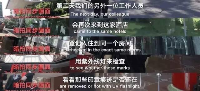 视频显示,评测人员登记入住后,会用特制的隐形印章在床上和卫生间多个地方做记号,记号只有在紫外线灯下才能看到,但很容易被抹擦清洗。之后,评测人员把房间弄乱,退房,第二天另一名评测人员去酒店登记入住同一间酒店,然后检测印记是否还在,以此判断用具有没有被清洗更换。