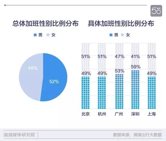 而在加班族的男女比例方面,滴滴大数据显示,总体来看男女比例相当,男性略多于女性。具体到各城市而言,广州、深圳的加班族中男性多于女性,男性在上班族中分别占到了53%和59%的比例。