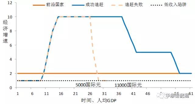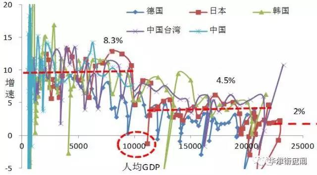 大家看这张图,横坐标是人均GDP,纵坐标是经济增速,样本是德、日、韩、中国台湾和大陆,大约在11000国际元前后,这些成功追赶的经济体都出现了经济增长平台的切换。