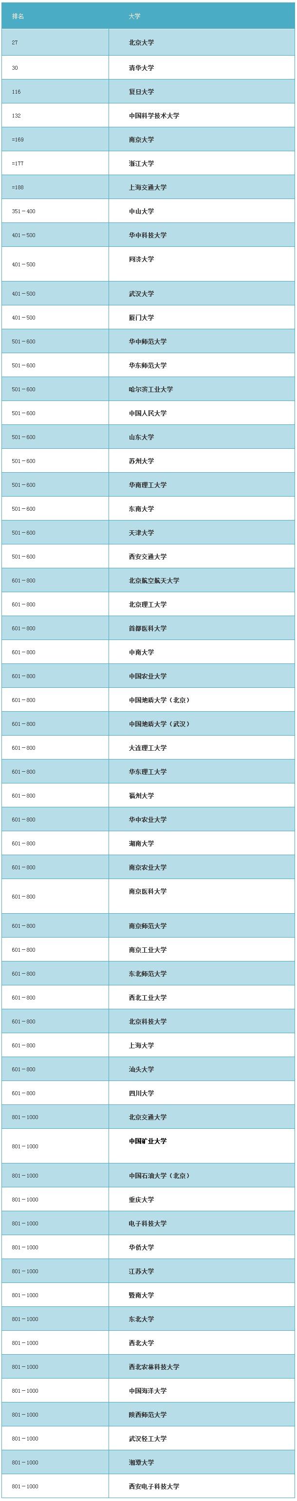 虽然英美高校继续雄踞榜单,但中国的大学也在逐年快速赶超,在此次排名中,中国有10所大学为首次上榜,是其历史上上榜大学最多的一次。北京大学为中国排名最高的大学,并列第27名。清华大学排第30名。以下为中国内地高校在排名中的情况: