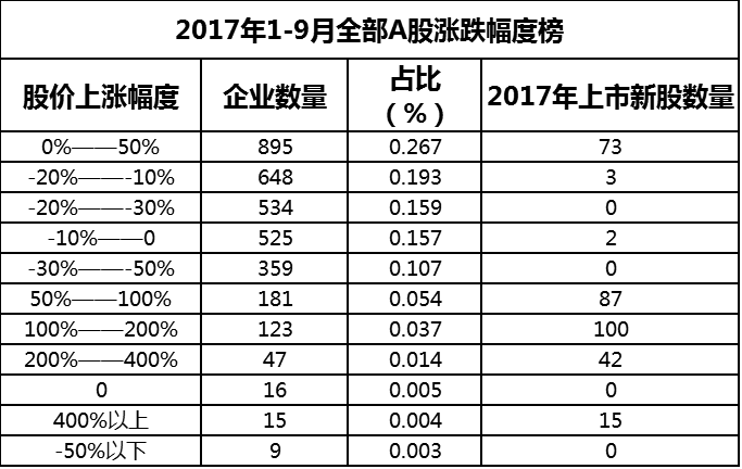 其中涨幅超过400%的股票有15只,全是2017年上市的新股,大部分股票的涨幅在50%以内。而熊股榜单中则有9只跌幅超过50%,其中有4只是*ST股。