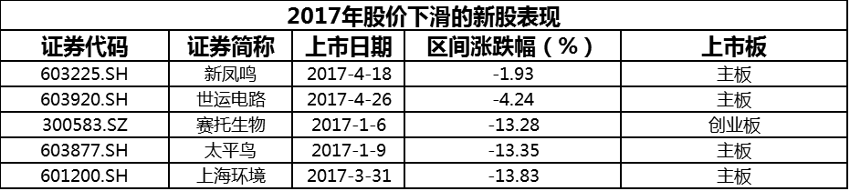 2017年上市的322只新股中,有5只新股的股价出现了不同程度的下滑。这五只新股分别是新凤鸣(603225.SH)、世运电路(603920.SH)、赛托生物(300583.SZ)、太平鸟(603877.SH)、上海环境(601200.SH),股价分别下跌了1.93%、4.24%、13.28%、13.35%和13.83%。
