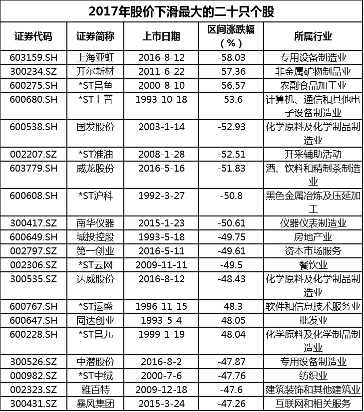值得注意的是,2017年股价跌幅最大的20只个股中,有8只是ST股。跌幅最甚的*ST昌鱼主业几乎停滞,上半年继续亏损,归属于上市公司股东的净利润为-1558万元。