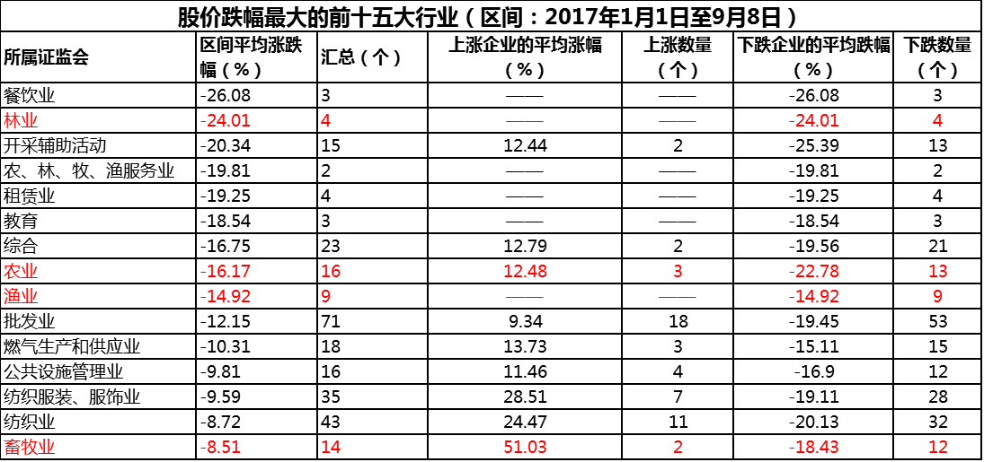 除了上述涨幅惊人的行业外,还有部分行业却陷入了二级市场行情的寒冬,餐饮、林业、渔业以及教育等6个行业甚至出现所有企业股价全数下跌的窘境。