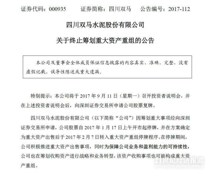 另外,记者了解到,2017 年 9 月 11 日四川双马还将以网络互动方式召开投资者说明会,就公司终止筹划重大资产重组相关情况与投资者进行互动交流和沟通,本报也会持续跟踪相关情况。