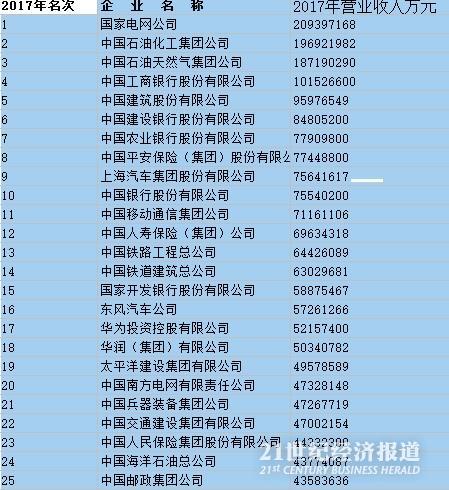 2017年名次 企业名称 2016年收入(万元) 2015年收入(亿元) 增速