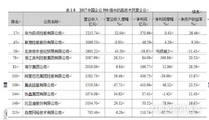 2016年民营企业中,有一批着眼于电子信息设备制造、互联网、汽车、家电、新能源的企业,它们已经具备了在全球市场进行竞争的实力。中国具有代表性的非金融民营企业是华为投资控股有限公司,它在2016年的营业收入首次突破5000亿元,净资产收益率达到26.46%。目前华为在全球电信设备制造领域居于领先地位,成为中国民族企业的代表和骄傲。