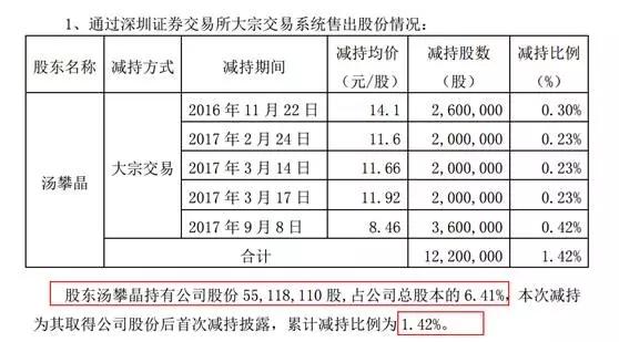可以看到,汤攀晶通过大宗交易减持手中股份累计套现约1.37亿元。9月8日通过大宗交易减持均价8.46元/股,减持价格基本在股价低位。此次减持后,汤攀晶持有公司股数下降至4291.8万股,占总股本比例4.99%,恰好在5%以下,减持的比例堪称精准。