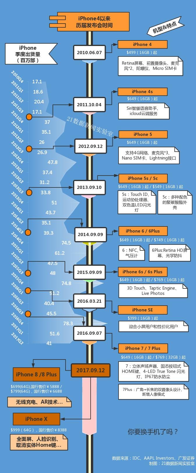 这十年来,iPhone的季度销售额增长225倍,2017年Q3财季营收达454.1亿美元,净利润为87.17亿美元。