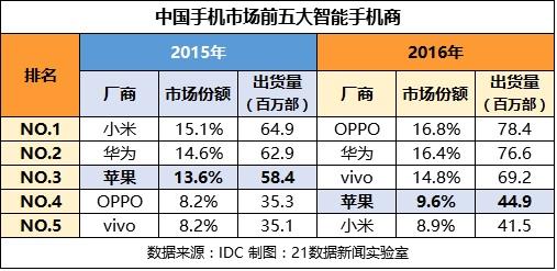 2016年,苹果在中国出货量为4490万部,市场份额为9.6%(2015年13.6%),与2015年相比,出货量同比下降23%。