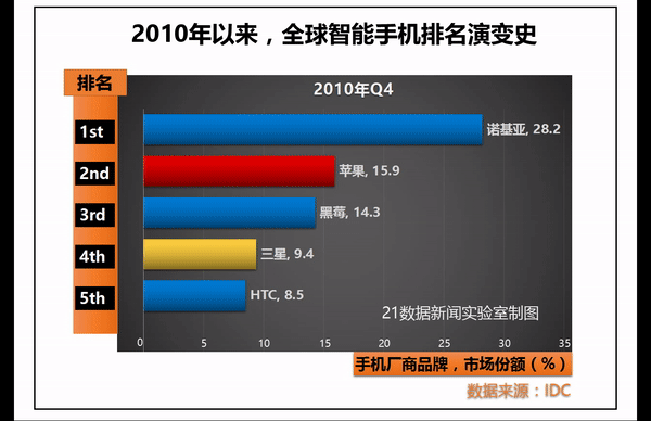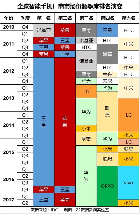 IDC数据显示,从全球市场份额来看,近7年来,苹果稳居排行榜前二的位置,跟三星你追我赶,争当第一。