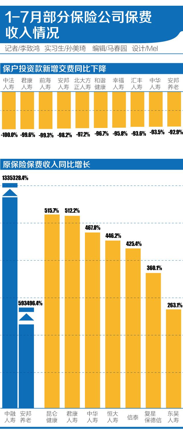 保监会数据显示,1-7月,保户投资款新增交费下降幅度超过90%的寿险公司包括中法人寿、君康人寿、前海人寿、安邦人寿、北大方正人寿、和谐健康险、幸福人寿、汇丰人寿、中华人寿、安邦养老险。