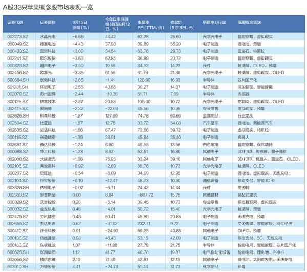 截至9月13日收盘,Wind苹果指数整体下跌1.12%,较早盘近2%的跌幅有所收窄。该指数中的33只A股相关成分股中,有22只下跌,10家上涨,1家持平。跌幅最大的为水晶光电,下跌6.68%,其次为德赛电池(000049.SZ),下跌4.43%。