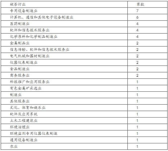 被否企业的按照行业分布:专用设备制造业被否7家,计算机、通信和其他电子设备制造业都被否6家,合计13家,占比约为27.08%。
