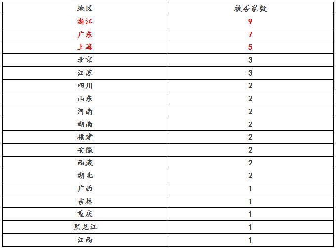 被否企业的按照地区分布:浙江9家、广东7家、上海5家,合计21家,占比约为43.75%