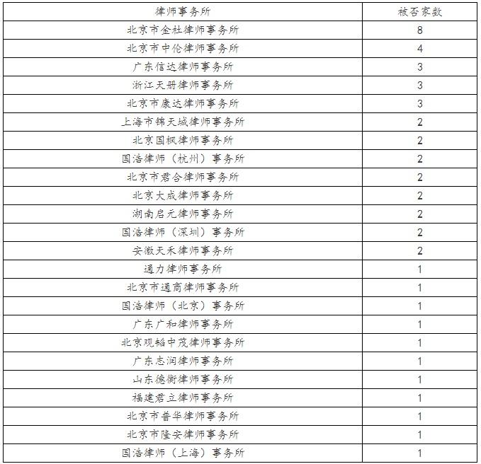 被否企业的按照律师事务所分布:金杜8家。有五家律所通过率为0,分别是广东志润律师事务所、山东德衡律师事务所、福建君立律师事务所、北京市普华律师事务所、北京市隆安律师事务所。